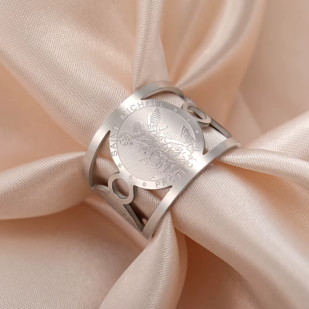 La bague réglable de Saint Michel est associée à une forte symbolique de protection. Elle incarne la présence bienveillante de l’archange, perçu comme un gardien spirituel veillant sur celui qui la porte.