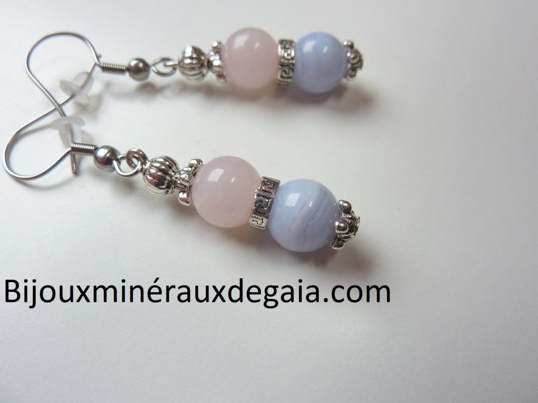 Boucles d’oreilles calcédoine bleue-Quartz rose rupture amoureuse