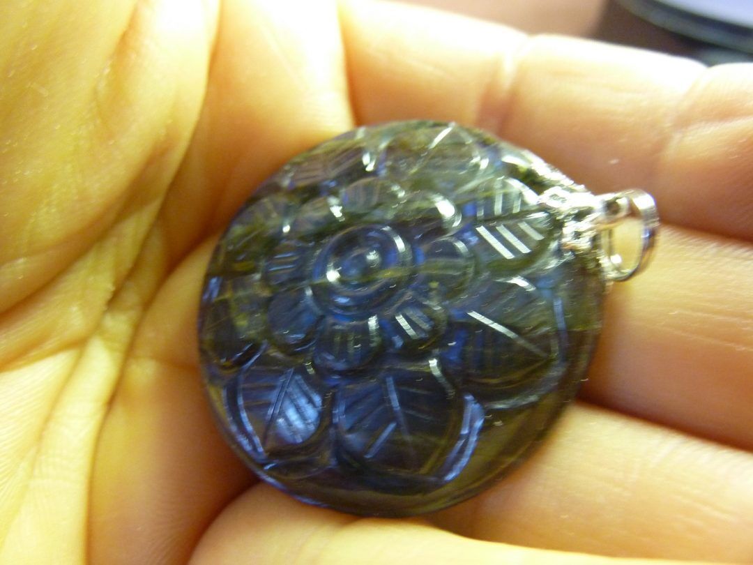 Gris bleu avec surface irisée. La plus puissante est à chatoiements bleus. Pierre très douce.