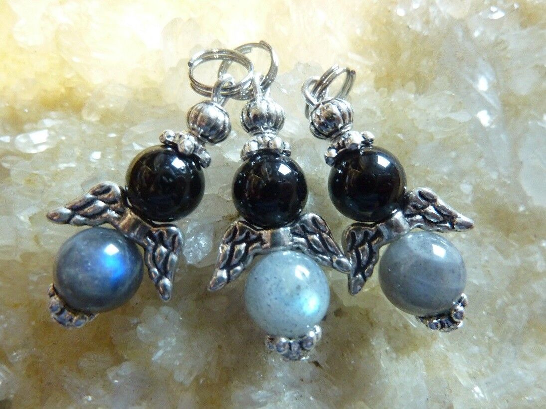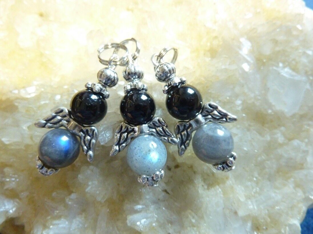 • PENDENTIF ANGE PROTECTION: LABRADORITE,SPINELLE NOIRE PERLES 8 MM