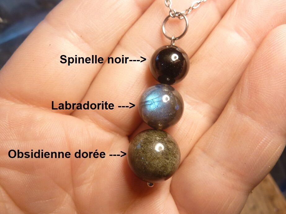 Pendentif Obsidienne dorée-Labradorite-Spinelle noir + chaine acier inoxydable 50 cm