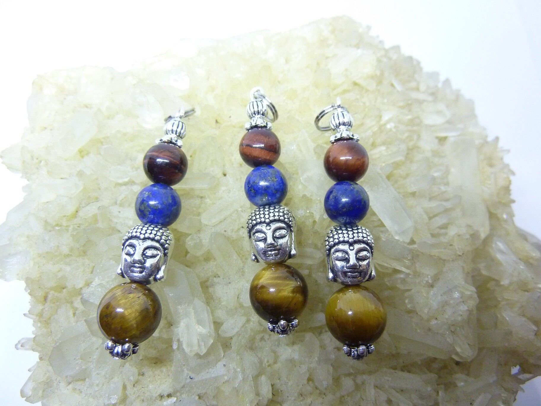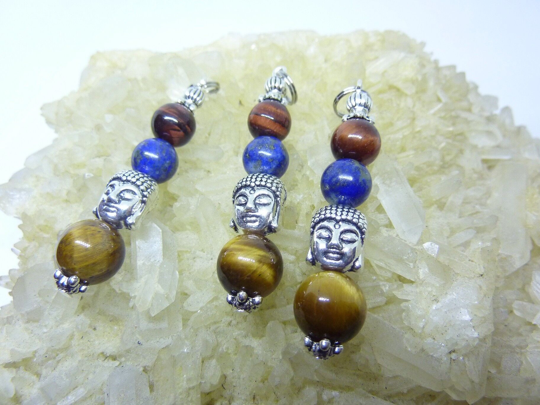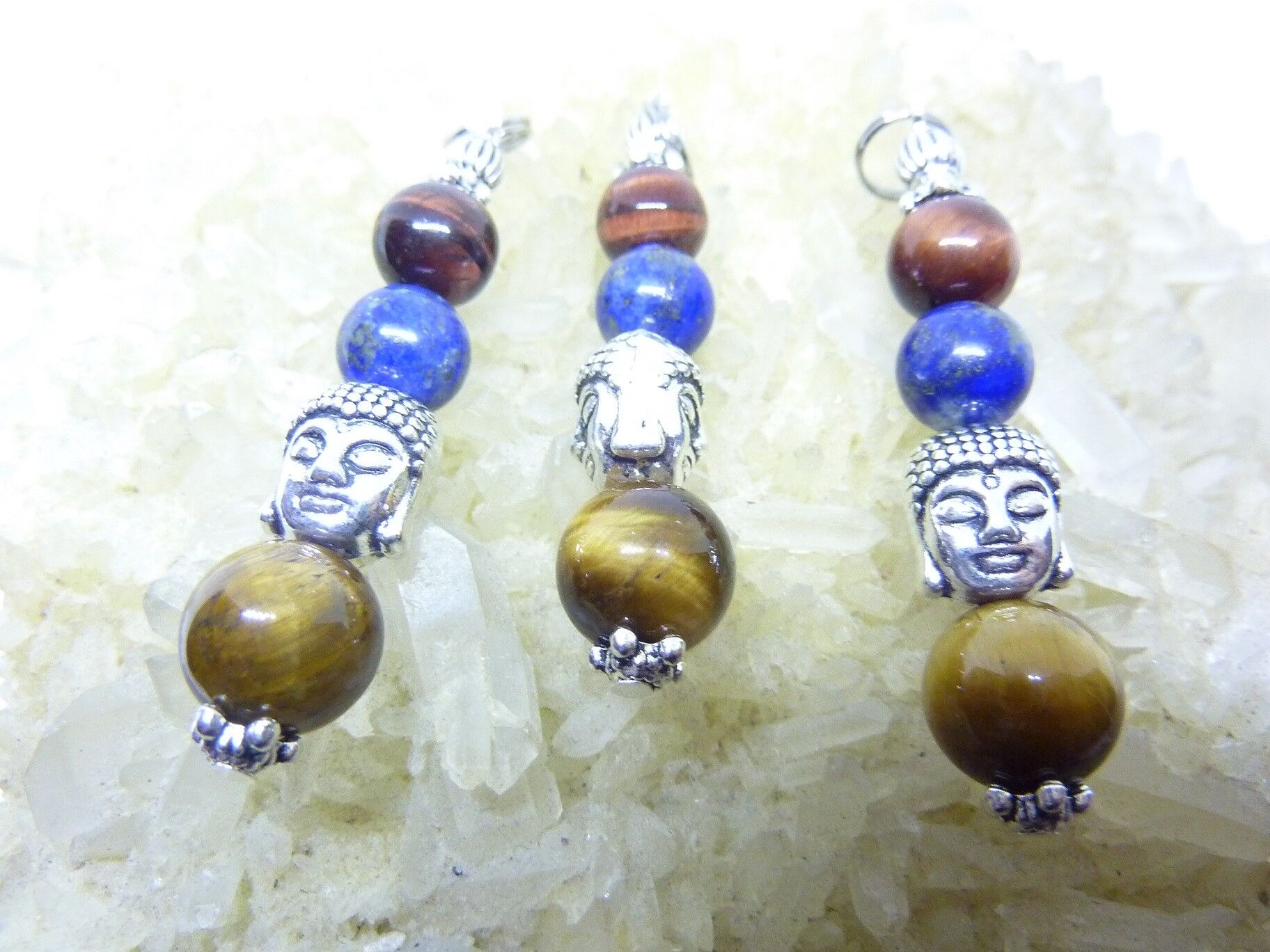 Découvrez notre magnifique pendentif de protection Bouddha en œil de tigre, taureau et lapis lazuli. Ce pendentif associe les propriétés protectrices et apaisantes de ces trois pierres puissantes.