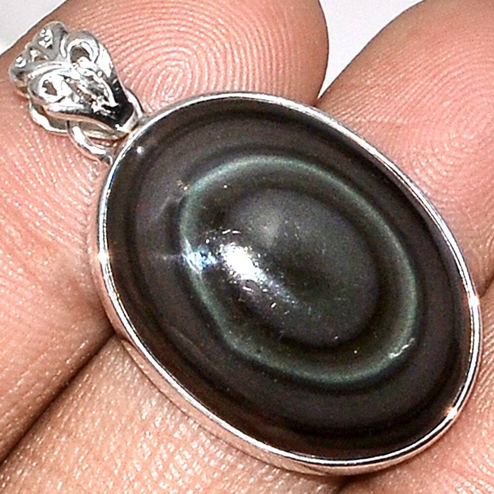 Pendentif protection obsidienne oeil celeste monture argent 925 ref 1762