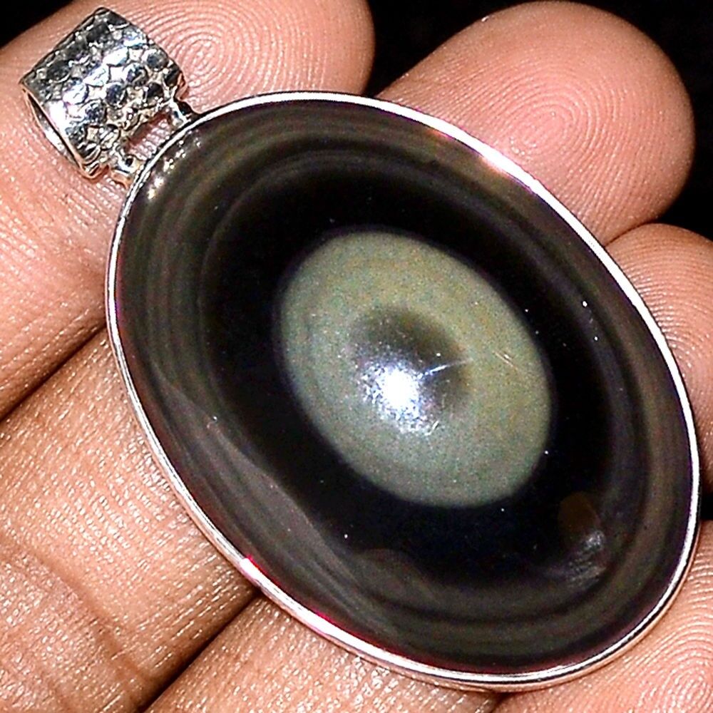 Pendentif protection obsidienne oeil celeste monture argent 925 ref 8454