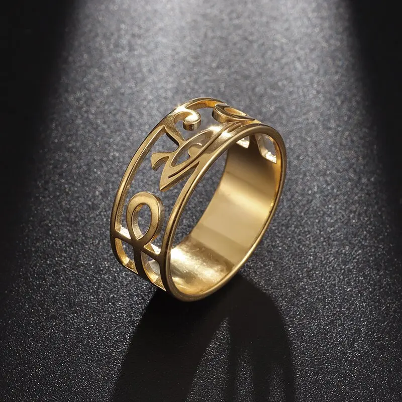 Découvrez cette sublime bague en acier inoxydable qui unit deux puissants symboles égyptiens : la croix de Ankh et l’œil d’Horus. La croix de Ankh, symbole de la vie éternelle, et l’œil d’Horus, représentant protection et clairvoyance, sont harmonieusement intégrés dans cette pièce de joaillerie. Cette bague est non seulement un accessoire élégant, mais elle est également chargée de signification et d’histoire, idéale pour ceux qui cherchent à incorporer des éléments de force et de protection dans leur style quotidien.