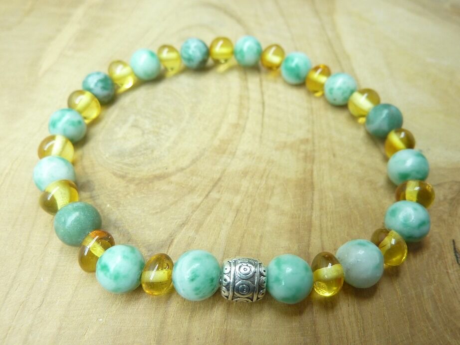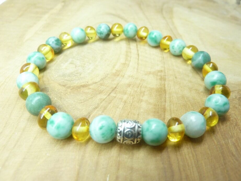 Découvrez l’alliance harmonieuse du Jade vert et de l’Ambre miel de la Baltique dans ce magnifique bracelet. Un mélange de pierres naturelles aux vertus énergétiques uniques.