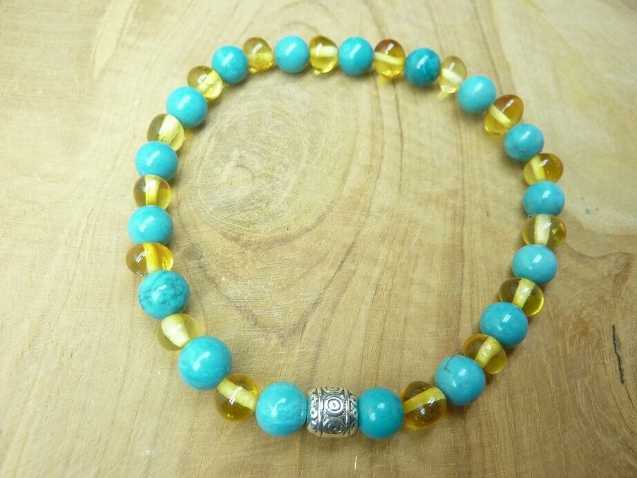 Découvrez le magnifique bracelet en Turquoise et Ambre miel de la Baltique, une combinaison enchanteresse de couleurs et de propriétés énergétiques.
