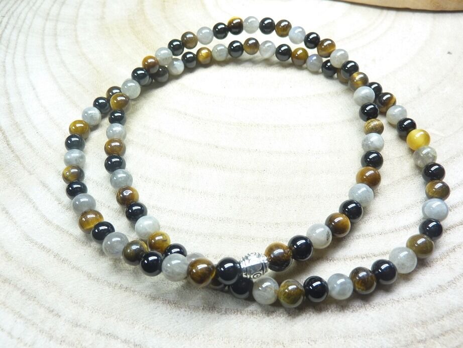 Découvrez notre collier unique en son genre, associant l’œil de tigre, la tourmaline noire et la labradorite. Ce collier est non seulement un bijou élégant, mais aussi un puissant talisman de protection.