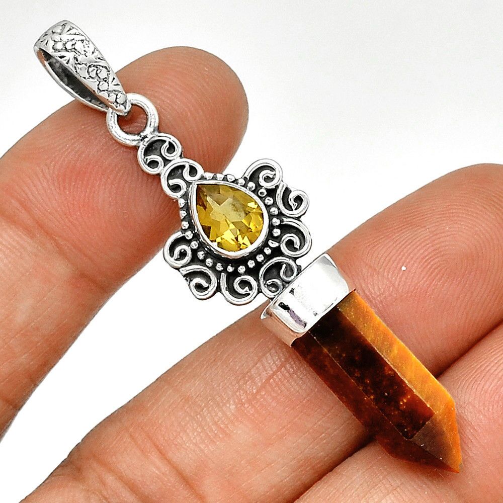 Pendentif Oeil de tigre-Citrine monture argent 925 top protection ref 0128