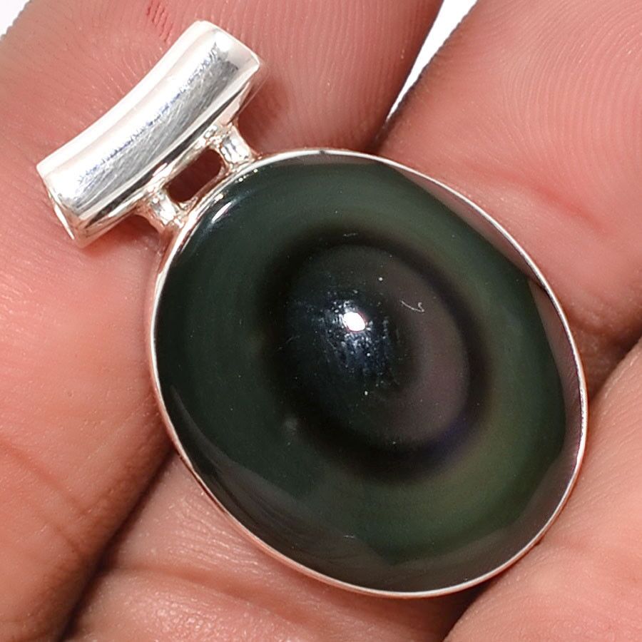 Pendentif protection obsidienne oeil celeste monture argent 925 ref 4178