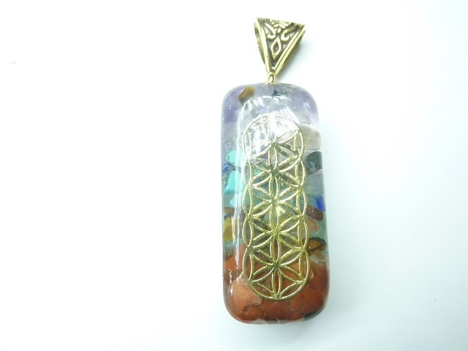 Ce bijou en orgonite rectangulaire, aux couleurs des 7 chakras, combine les bienfaits de l’orgonite et de la Fleur de Vie.