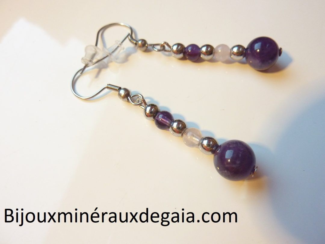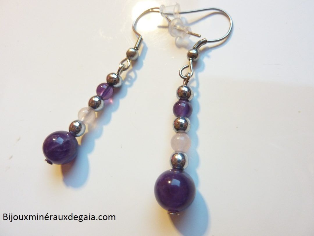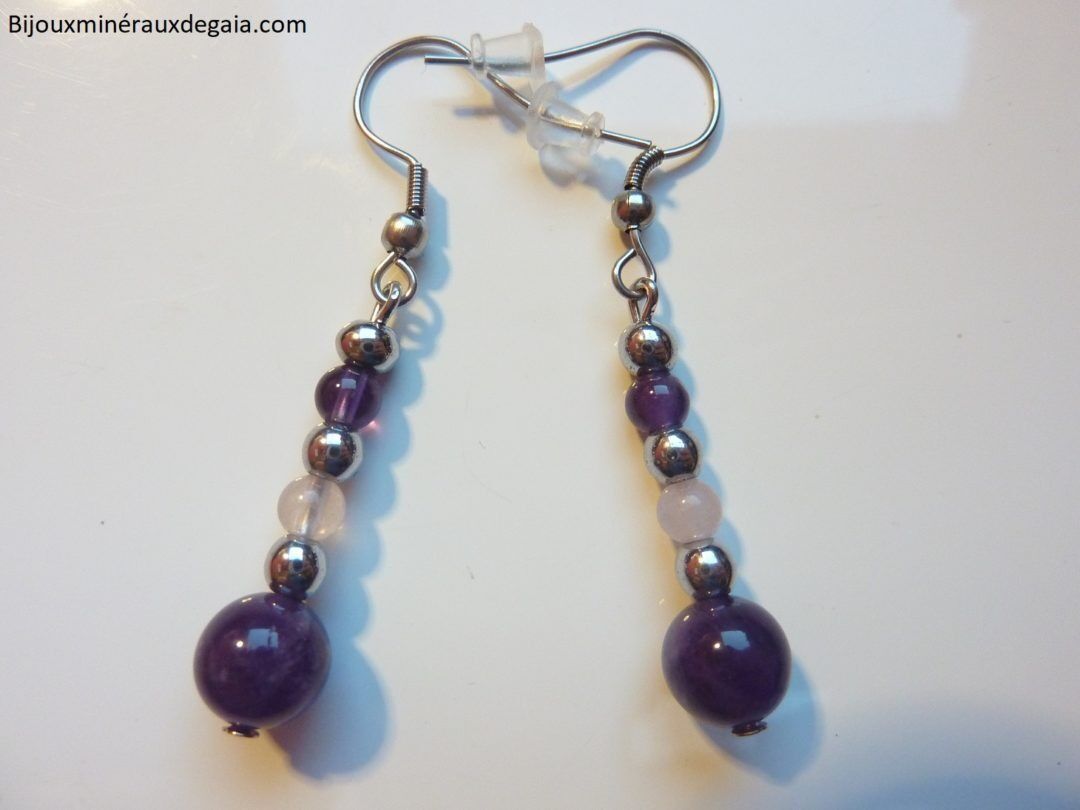 Boucles d’oreilles Améthyste-Quartz rose-Hématite perles rondes 6-4 mm