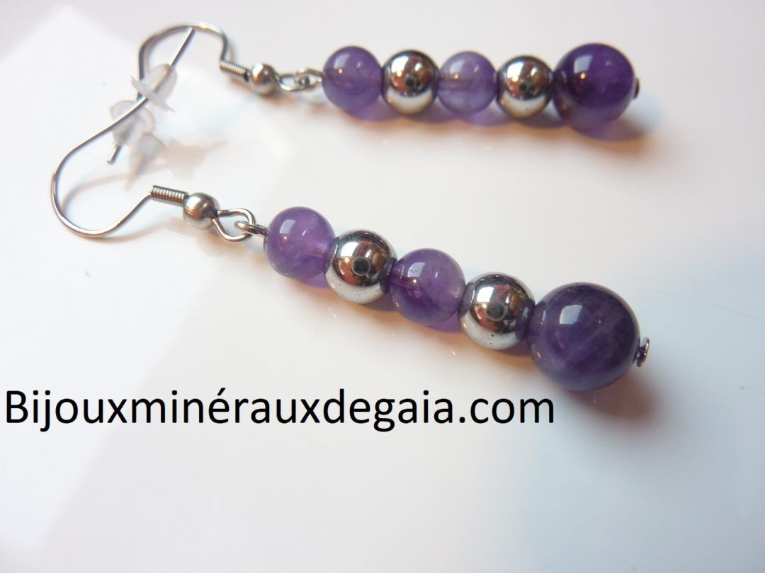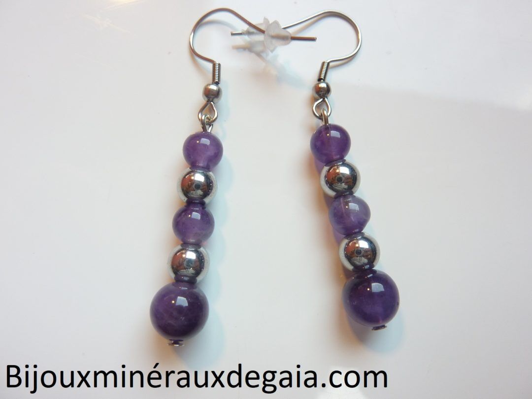 BOUCLES D’OREILLES AMETHYSTE,HEMATITE PERLES RONDES 8-6 MM