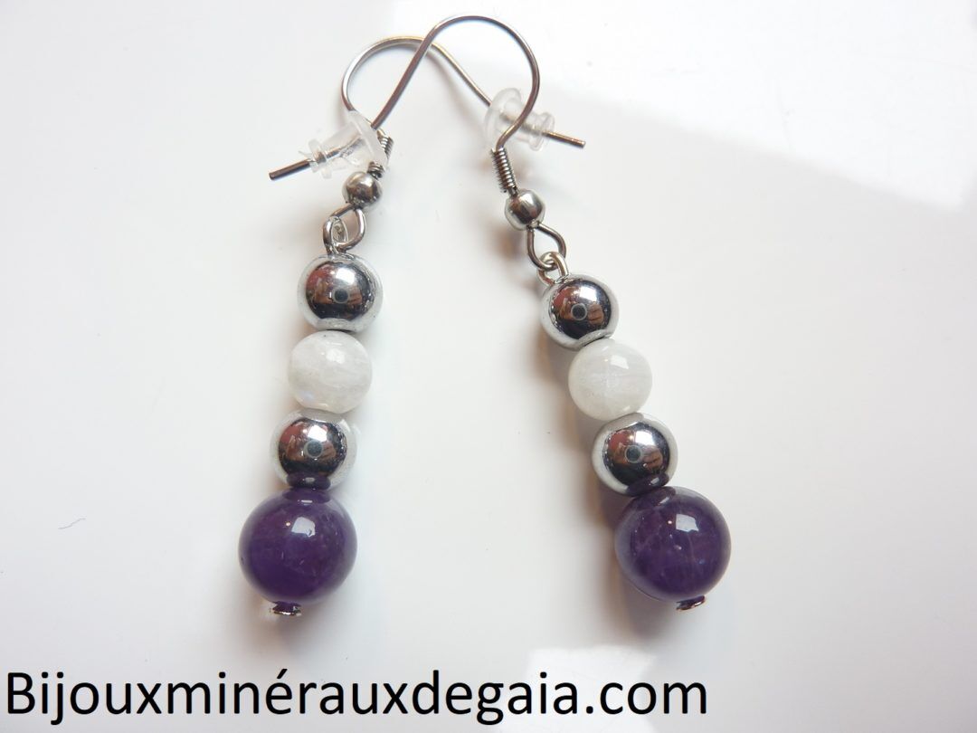 Boucles d’oreilles Pierre de lune-Améthyste-Hématite: perles rondes 8-6 mm