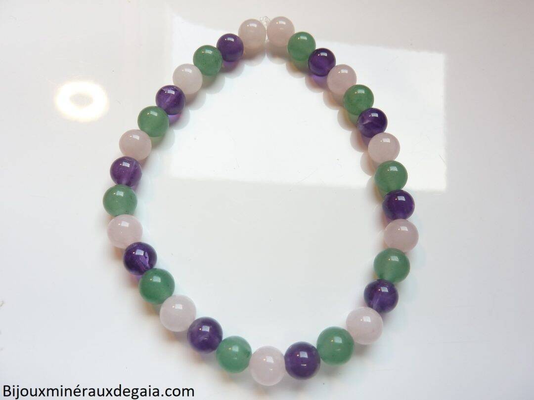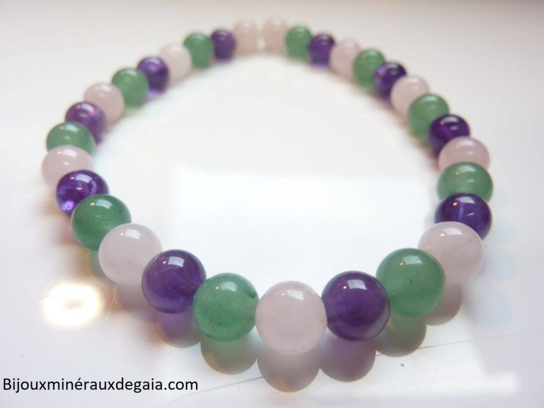 Bracelet Améthyste-Quartz rose-Aventurine verte perles rondes 6 mm