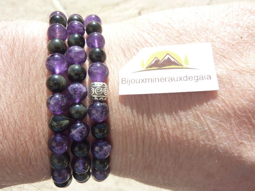 Collier ou bracelet Améthyste-Obsidienne oeil céleste perles rondes 6 mm