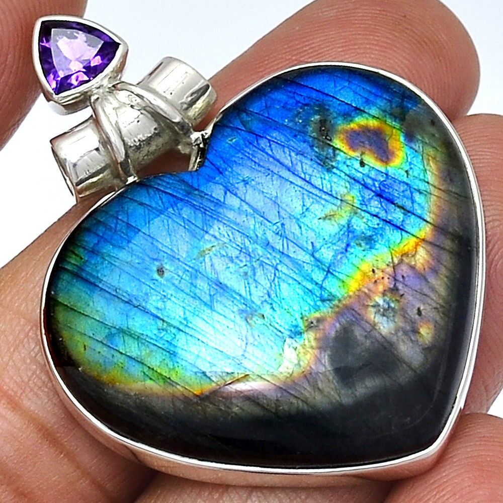 Pendentif coeur labradorite-Améthyste monture argent 925 ref 8332