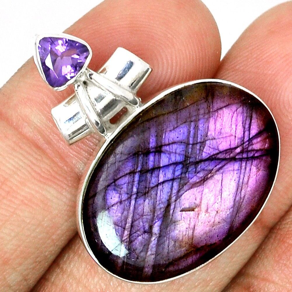 Pendentif protection labradorite violet-Améthyste monture argent 925 ref 0246