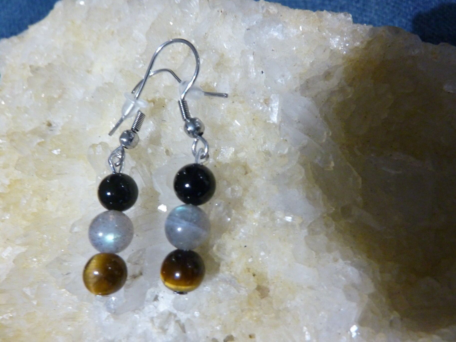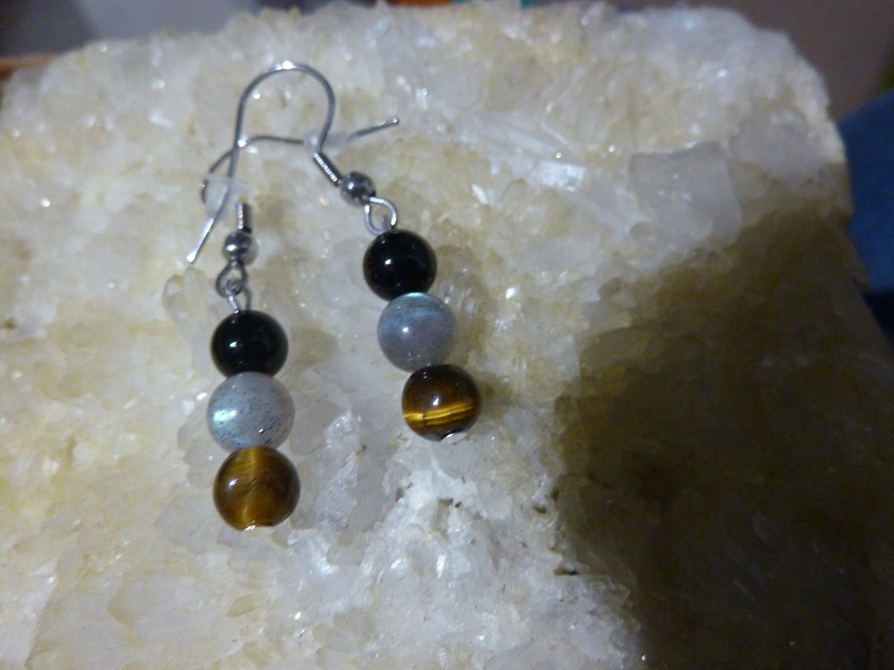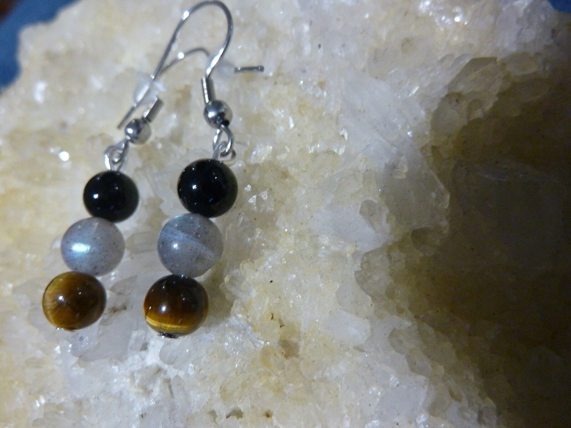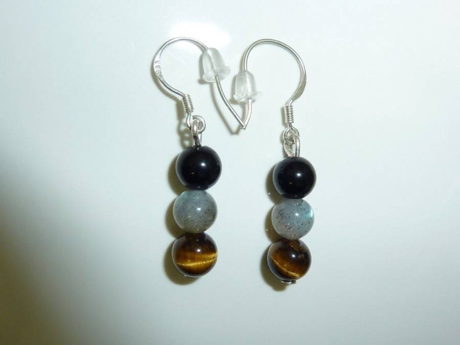 Photo non contractuelle , vous recevrez des Boucles d’oreilles Oeil de tigre-Labradorite-Tourmaline noire de qualité identique