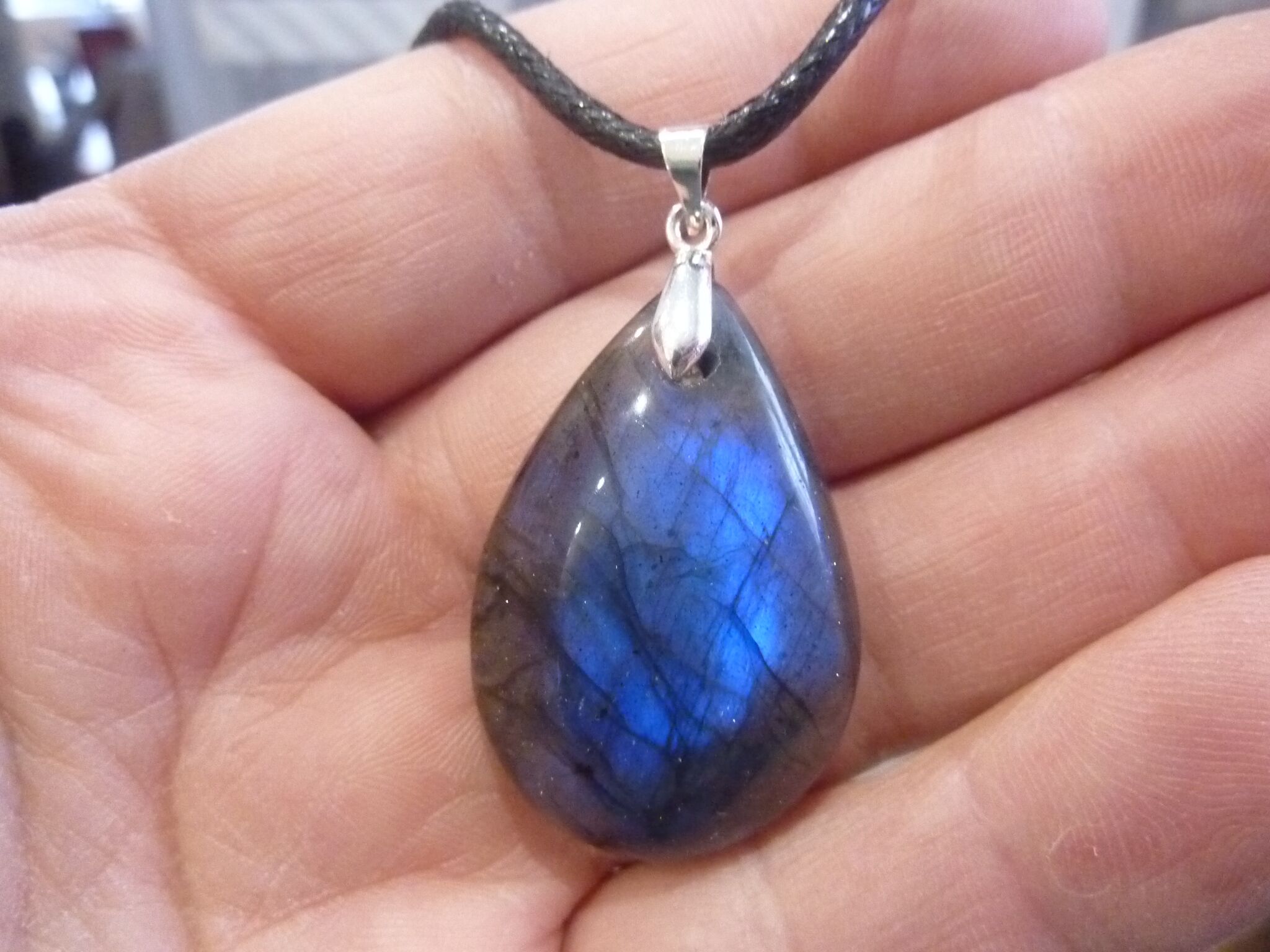 Livré avec collier cordon en coton ciré solide et durable longueur 58 cm + 4 cm ,comme les autres pendentifs en Labradorite du site !