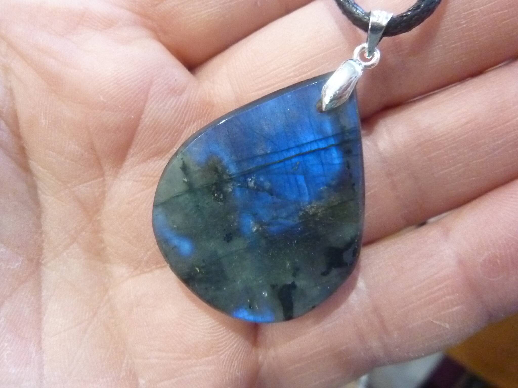 Livré avec collier cordon en coton ciré solide et durable longueur 58 cm + 4 cm ,comme les autres pendentifs en Labradorite du site !
