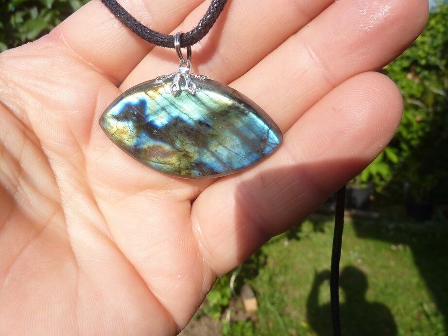 Livré avec collier cordon en coton ciré solide et durable longueur 58 cm + 4 cm ,comme les autres pendentifs en Labradorite du site !