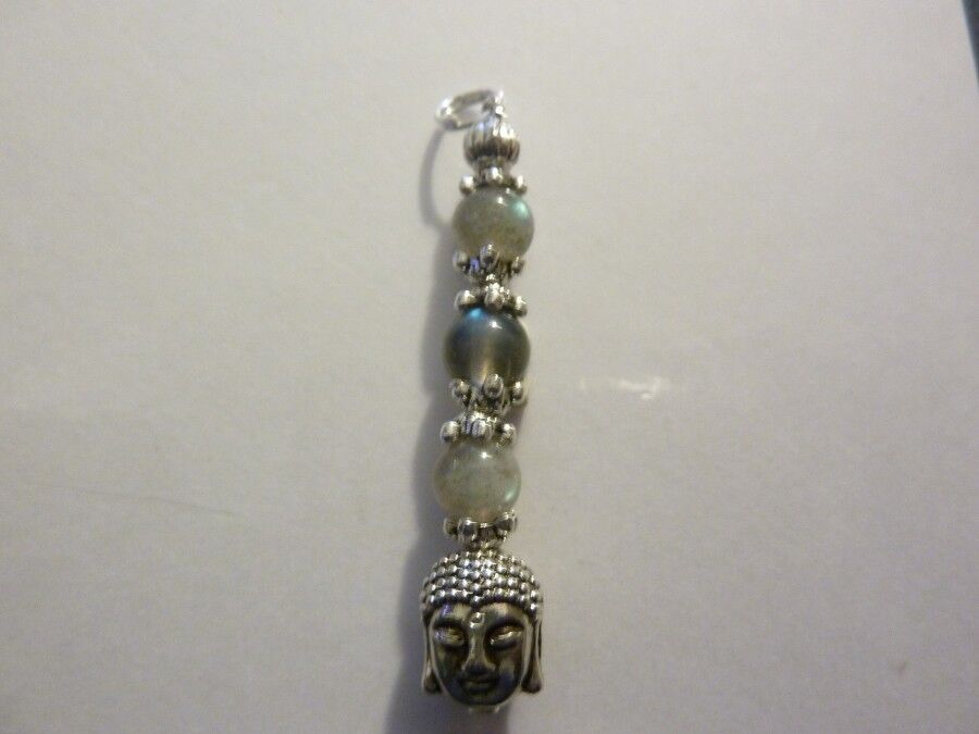 Pendentif protection Bouddha Labradorite perles 6mm longueur 4,6 cm