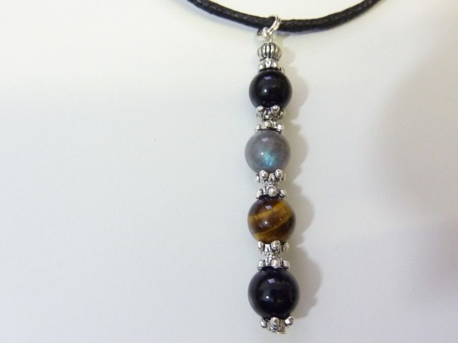 Découvrez notre impressionnant pendentif de protection orné d’œil de tigre, de labradorite, de tourmaline et d’obsidienne œil céleste. Ce pendentif est un véritable talisman de puissance et de protection, combinant les propriétés uniques de ces quatre pierres naturelles.