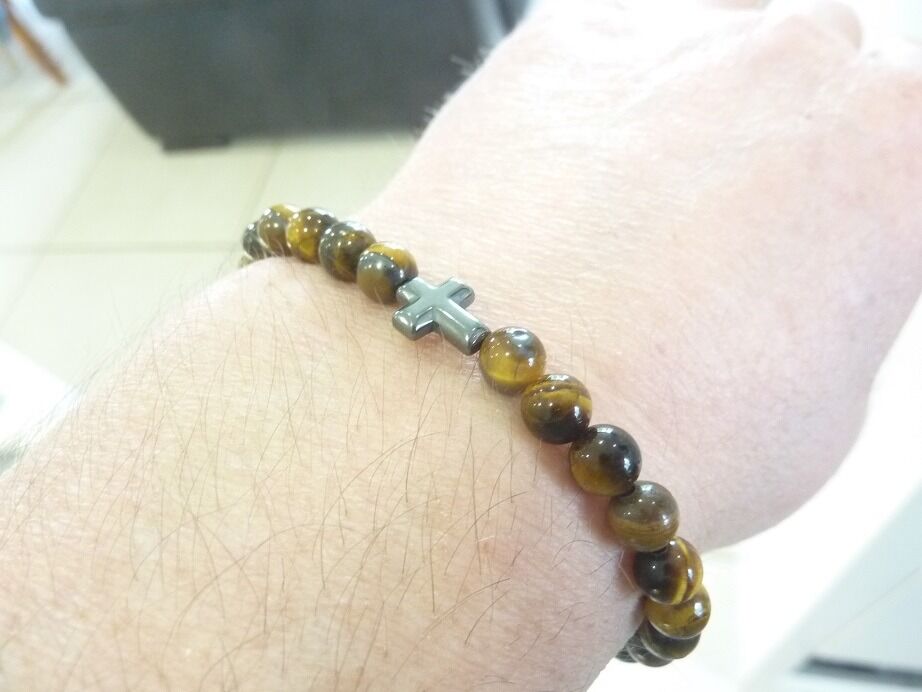 Bracelet Oeil de tigre-Croix réglable perles 6 mm