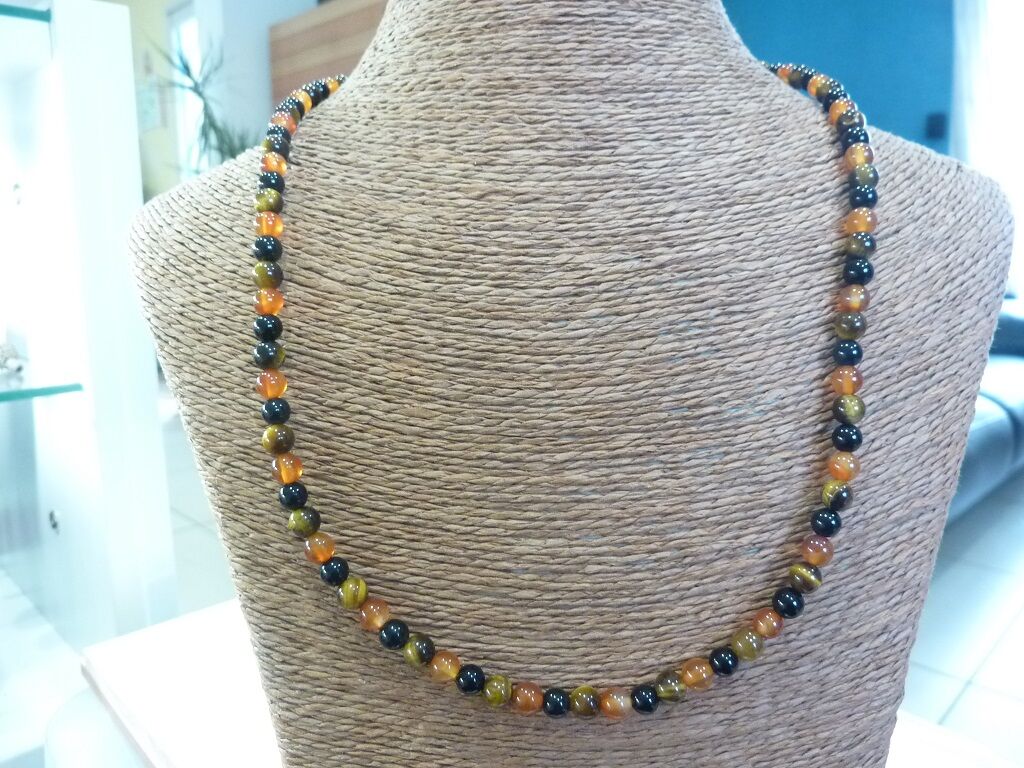 Collier Oeil de tigre-taureau-cornaline-tourmaline noire