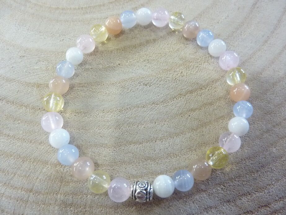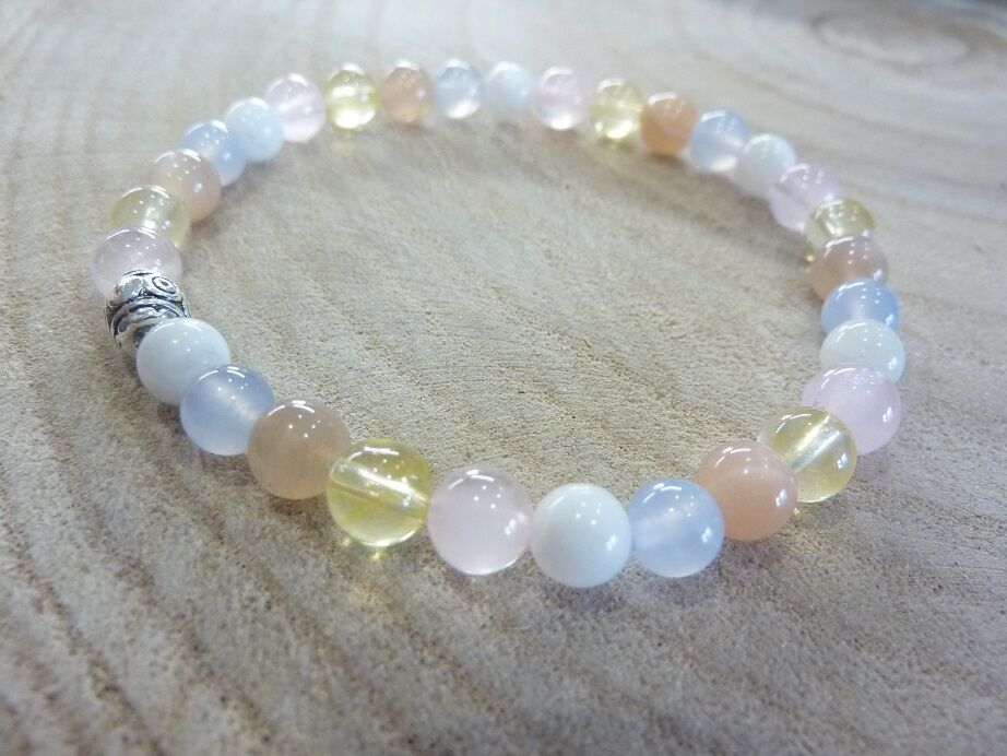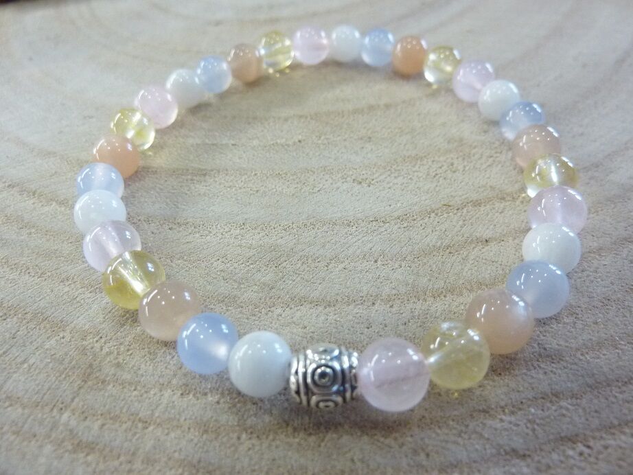 Bracelet citrine-pierre de lune-Calcédoine bleue-quartz rose-Pierre de soleil perles rondes 6 mm