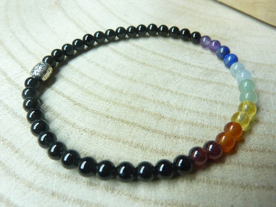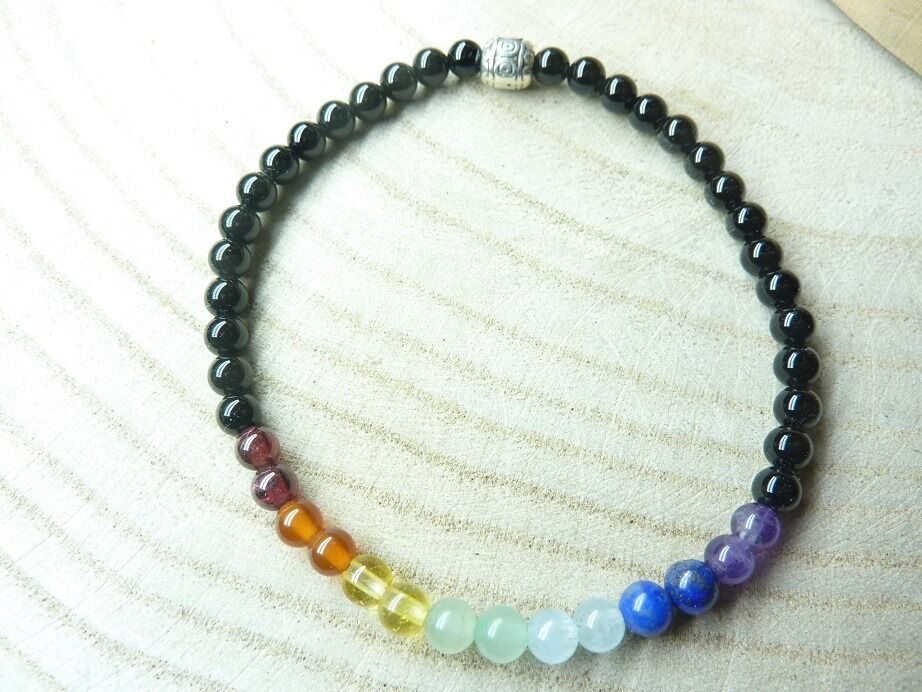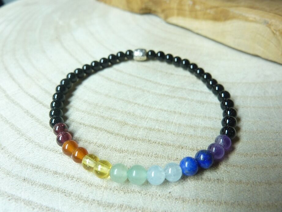 Chaque perle de 4 mm représentera un chakra différent, aligné du bas vers le haut, en suivant l’ordre des chakras principaux : chakra racine, chakra sacré, chakra du plexus solaire, chakra du cœur, chakra de la gorge, chakra du troisième œil et chakra couronne.