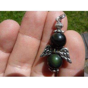 PENDENTIF OBSIDIENNE OEIL CELESTE ET PERLE AILES D’ANGE EN PLAQUé ARGENT