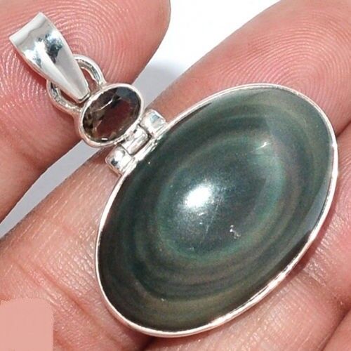 Pendentif obsidienne oeil celeste quartz fumé argent 925 ref 0440